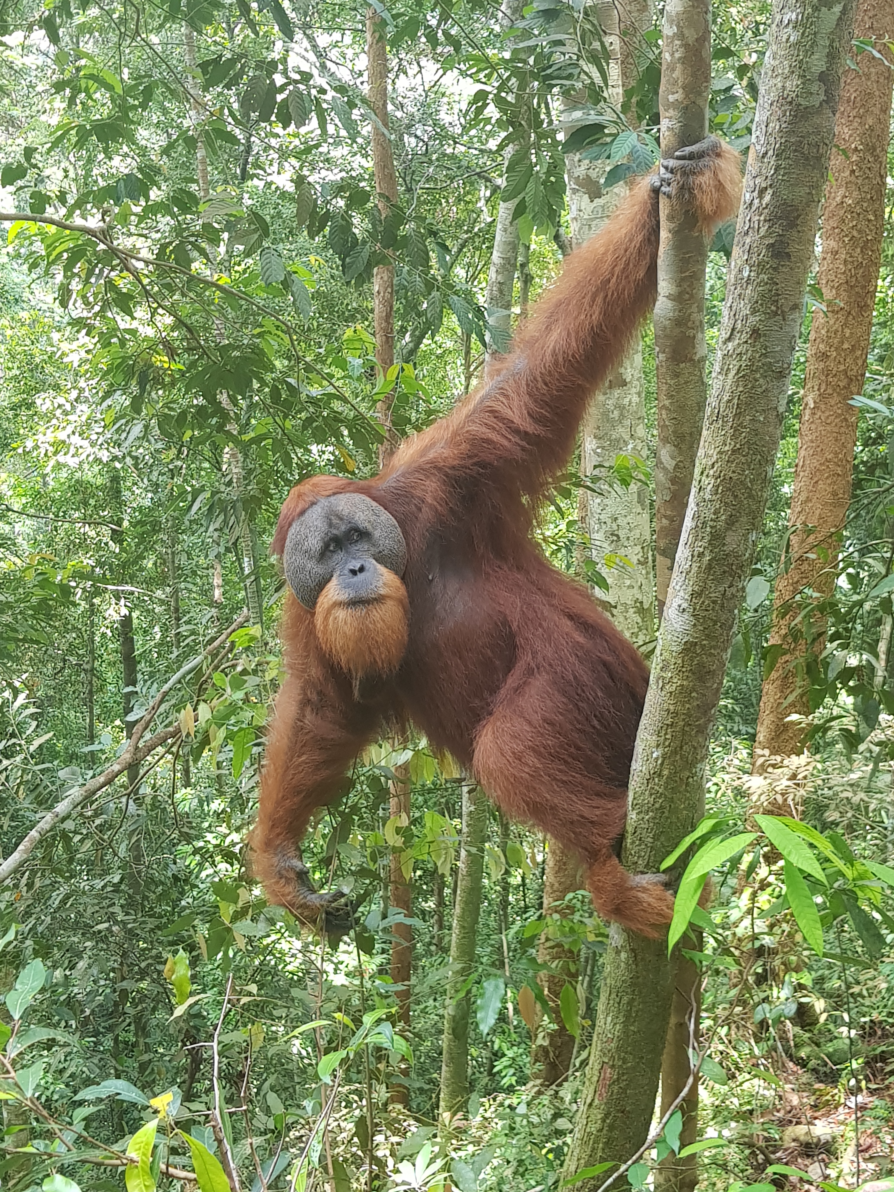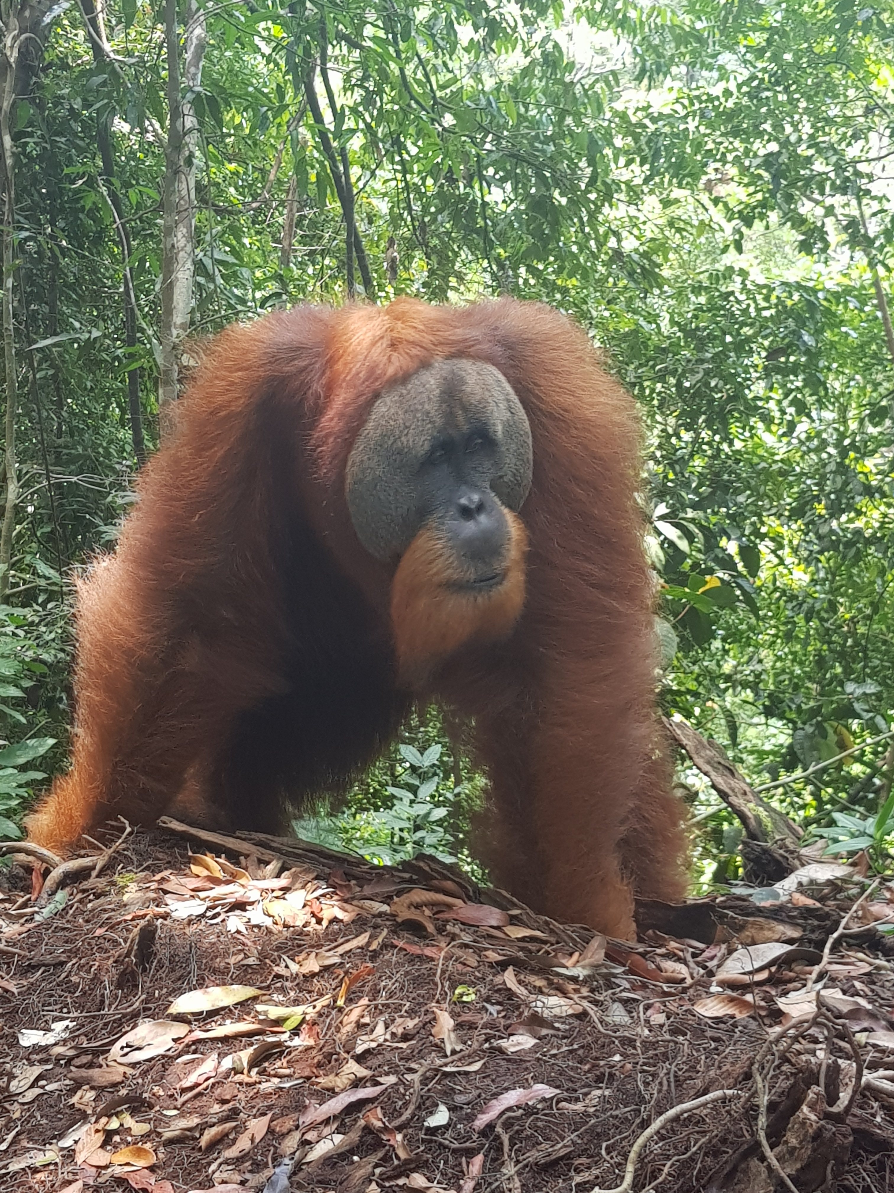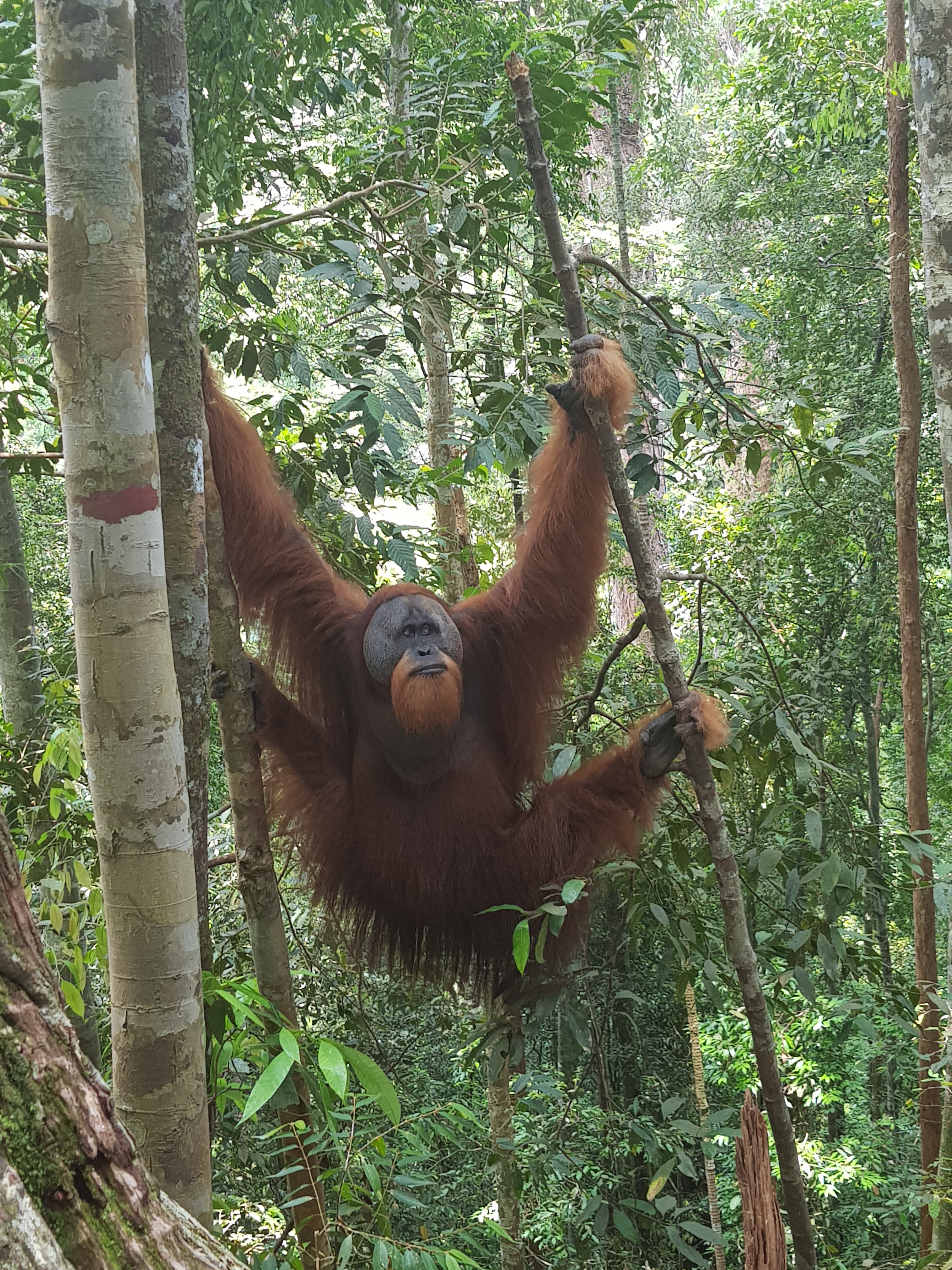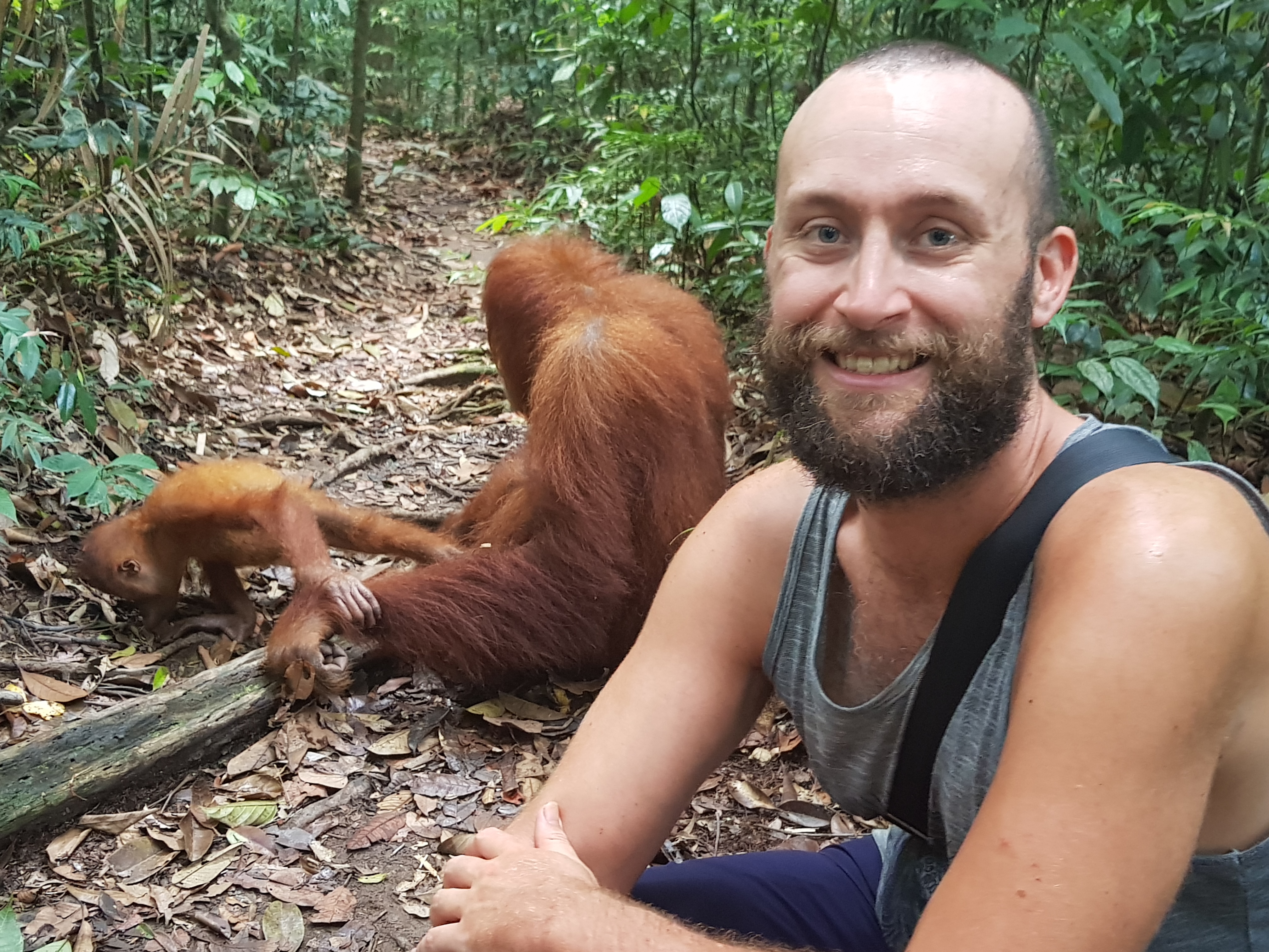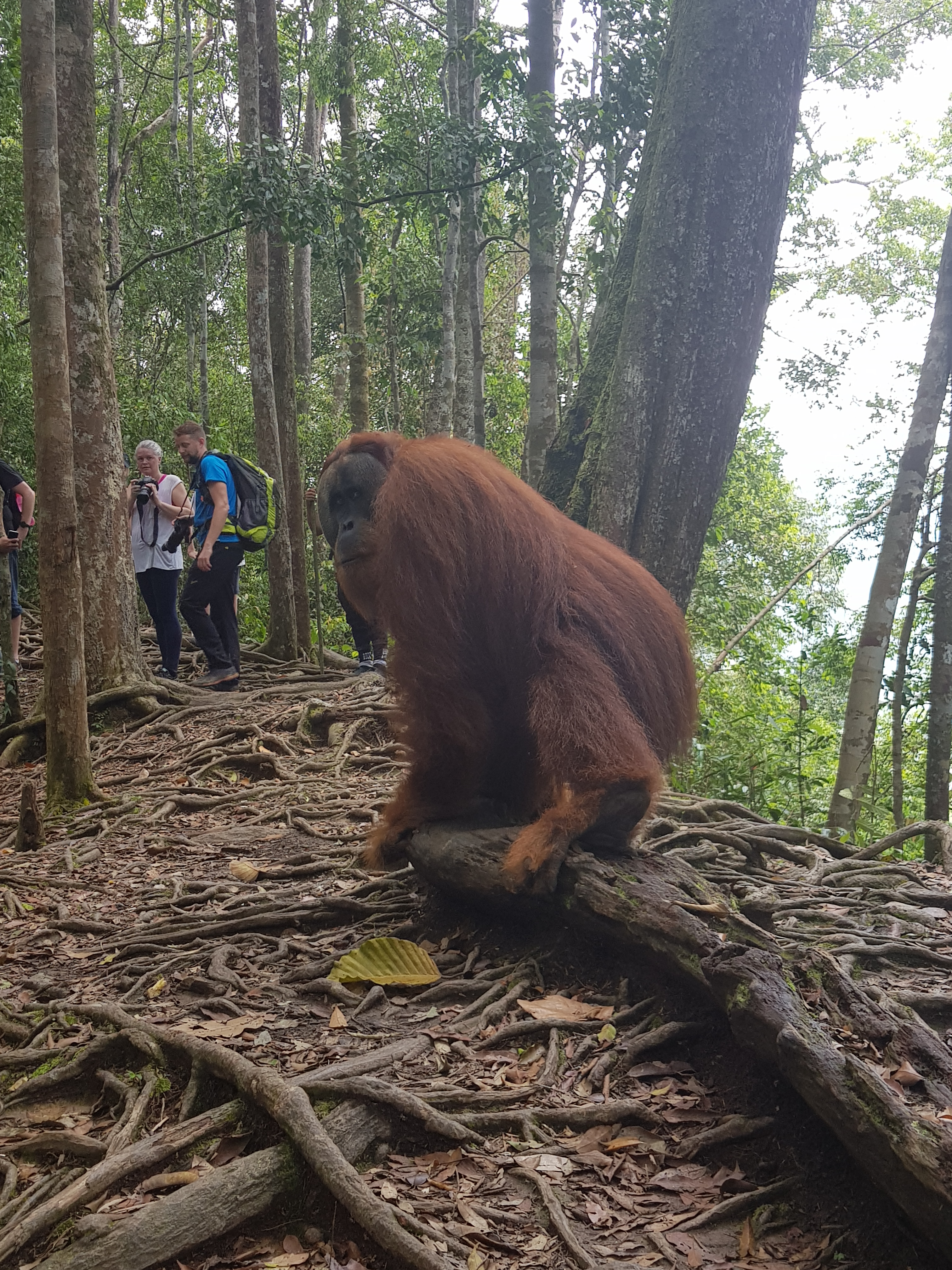 The next day we went on our jungle trek. We met our guide in the morning at our accommodation. After a quick breakfast and coffee, we set off on our trek. It was hot. It was humid. It was sweaty. But, it was beautiful. We ascended the jungle along a well-trodden path. We took a break about every 30 minutes to gulp in the thick humid air in hope of catching our breath. Apparently, we were “lucky” that day as we saw about 9 orangutans. I would’ve said wild orangutans but they seemed far too content with humans stomping in and out of their territory snapping a million pictures from every possible angle. I would say semi-wild at most. One of the baby orangutans even climbed into our guide’s arms as a child would in their father’s after being apart for some time. Wild, not so much. Tame, yes.