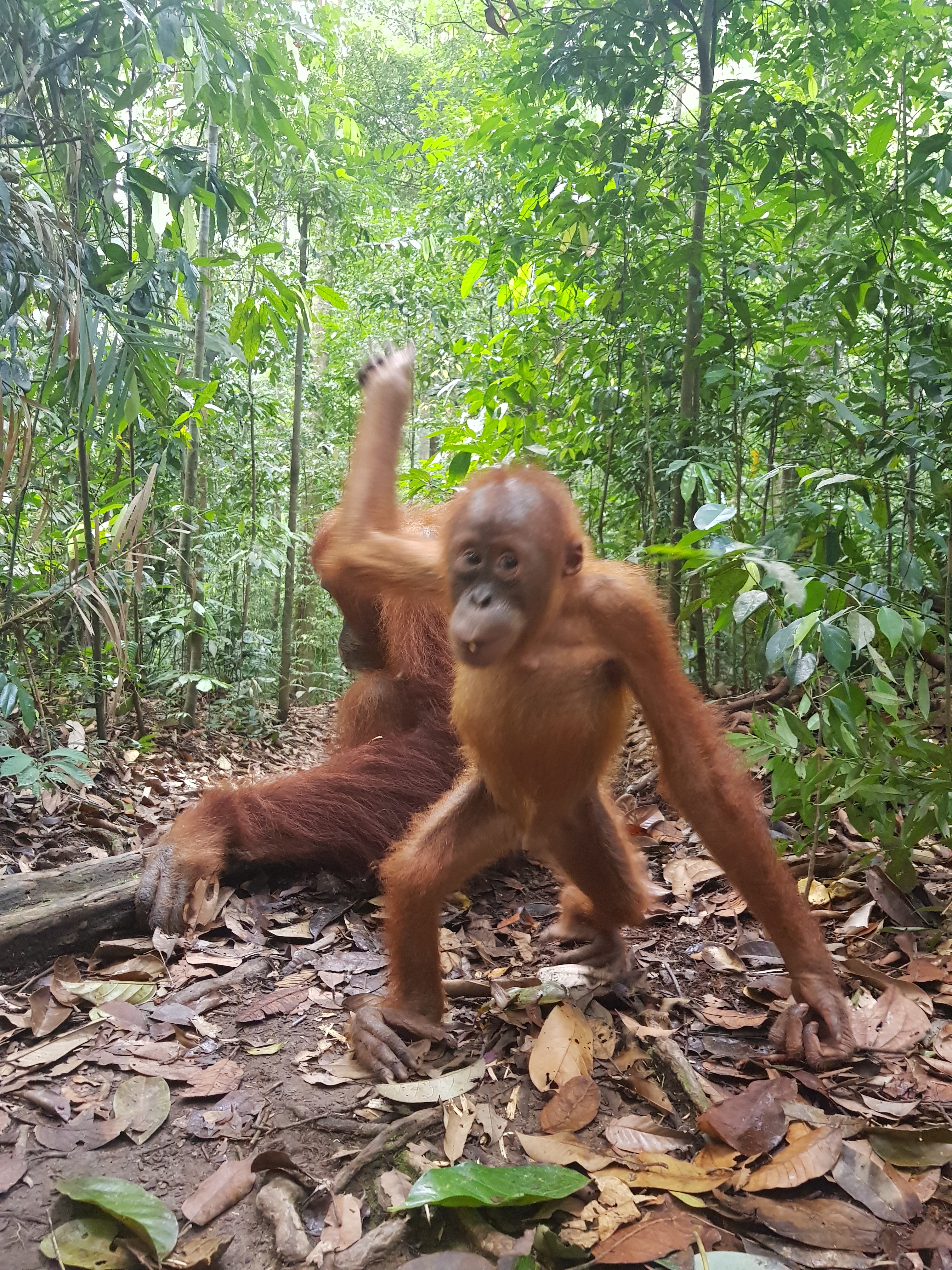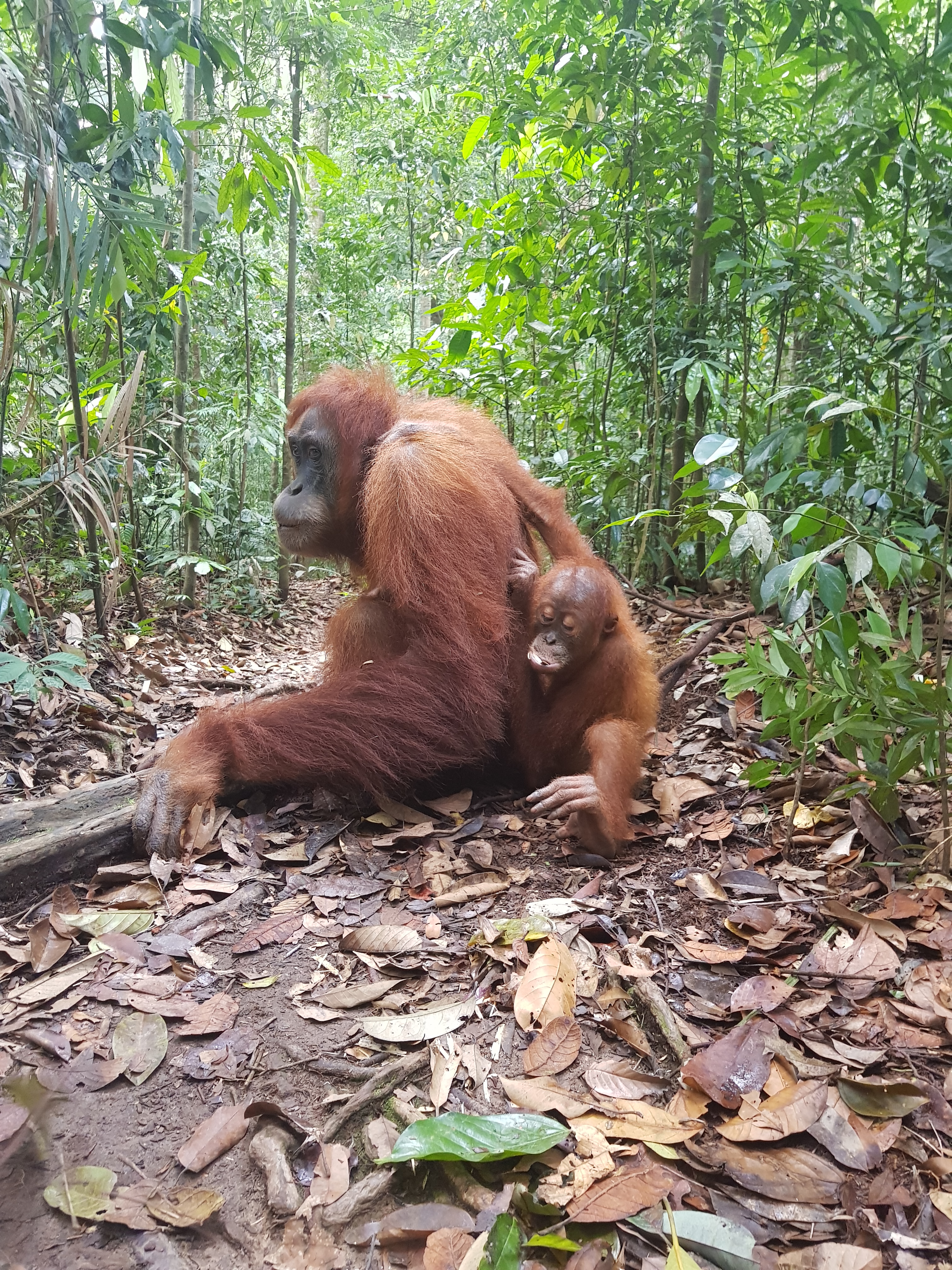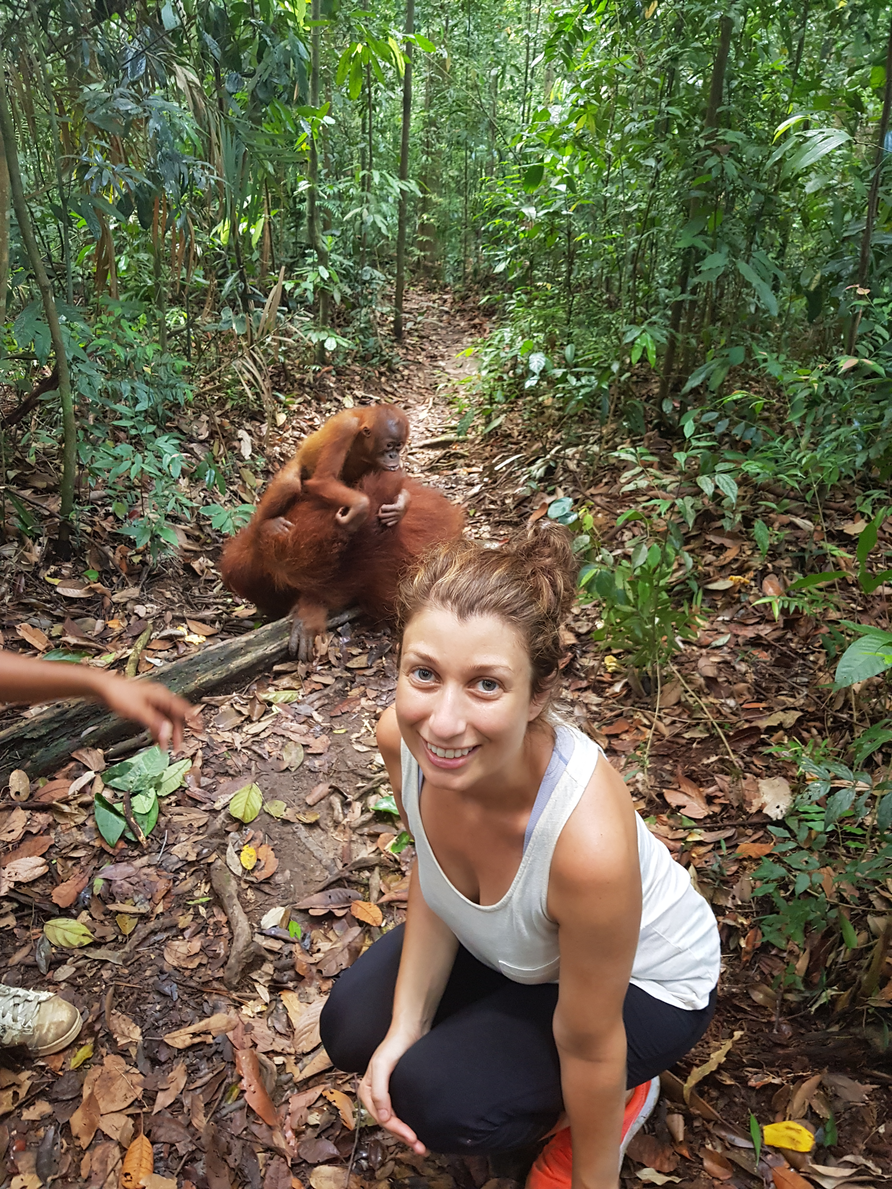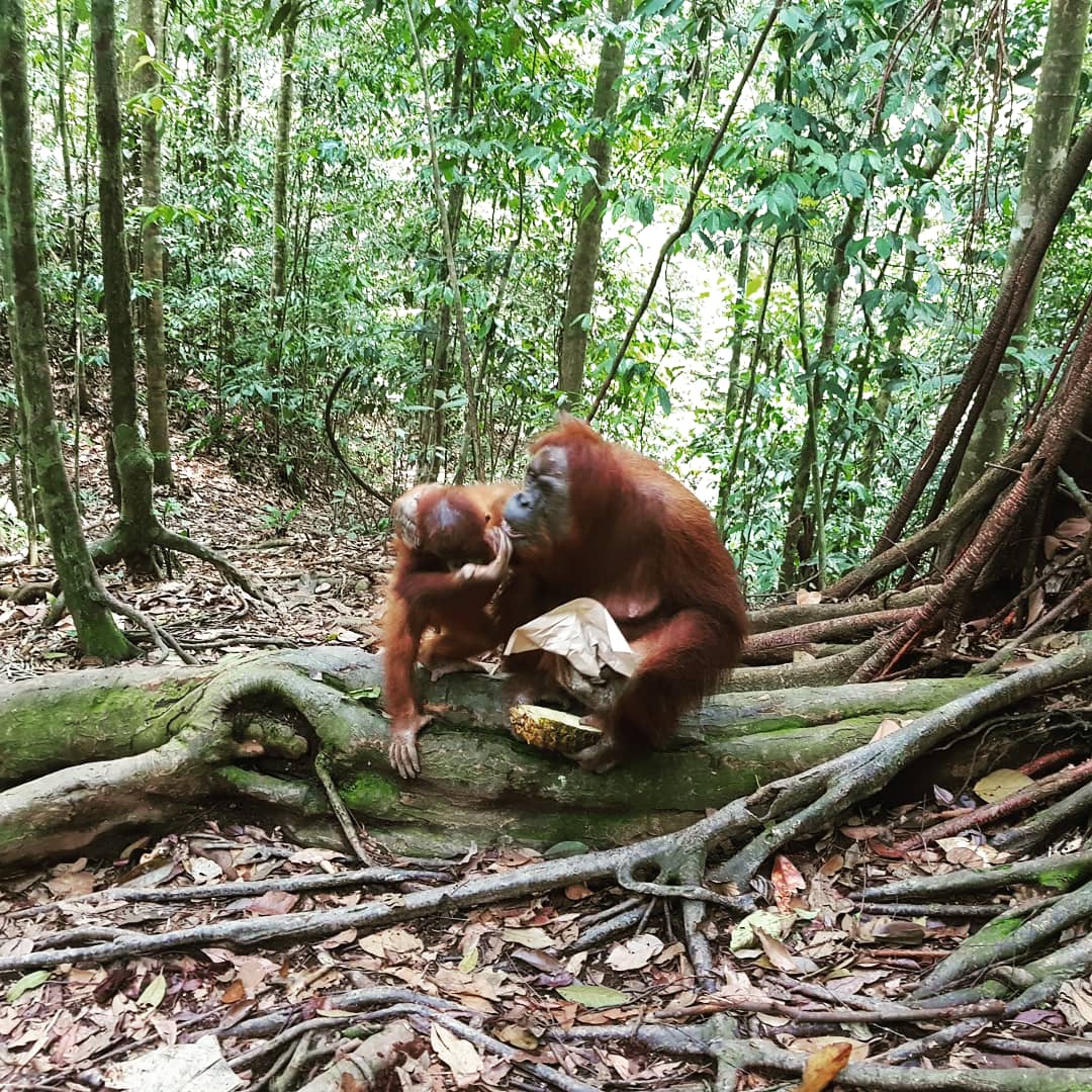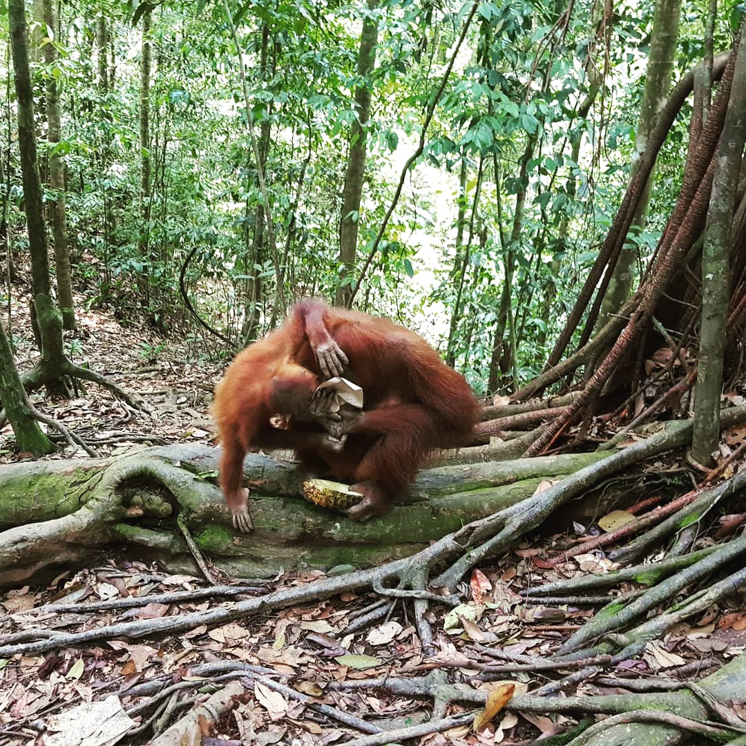 There was one orangutan that definitely carried a chip on her shoulder, Mina. Apparently, she was rescued after being someone’s pet and was integrated back into the wild. That being said, she has bitten about 70 people. While we were eating our jungle nasi-goreng lunch, she came down the path with her infant and robbed Celeste of her lunch. Our guide told us to hand over our food if she tries to take it otherwise be prepared for an orangutan bite.